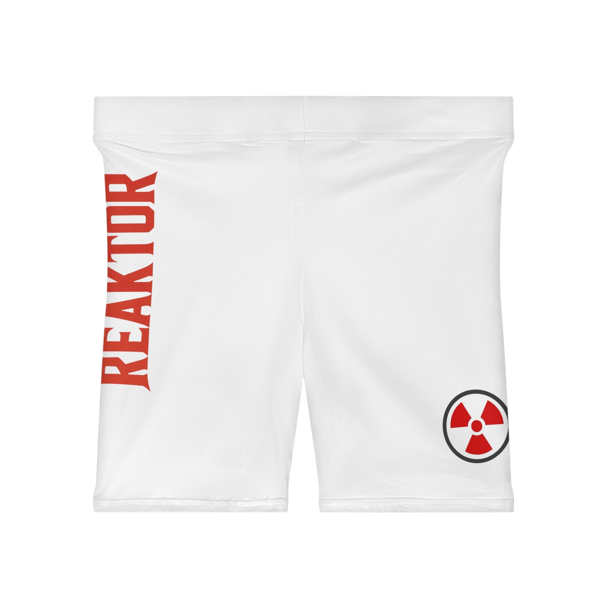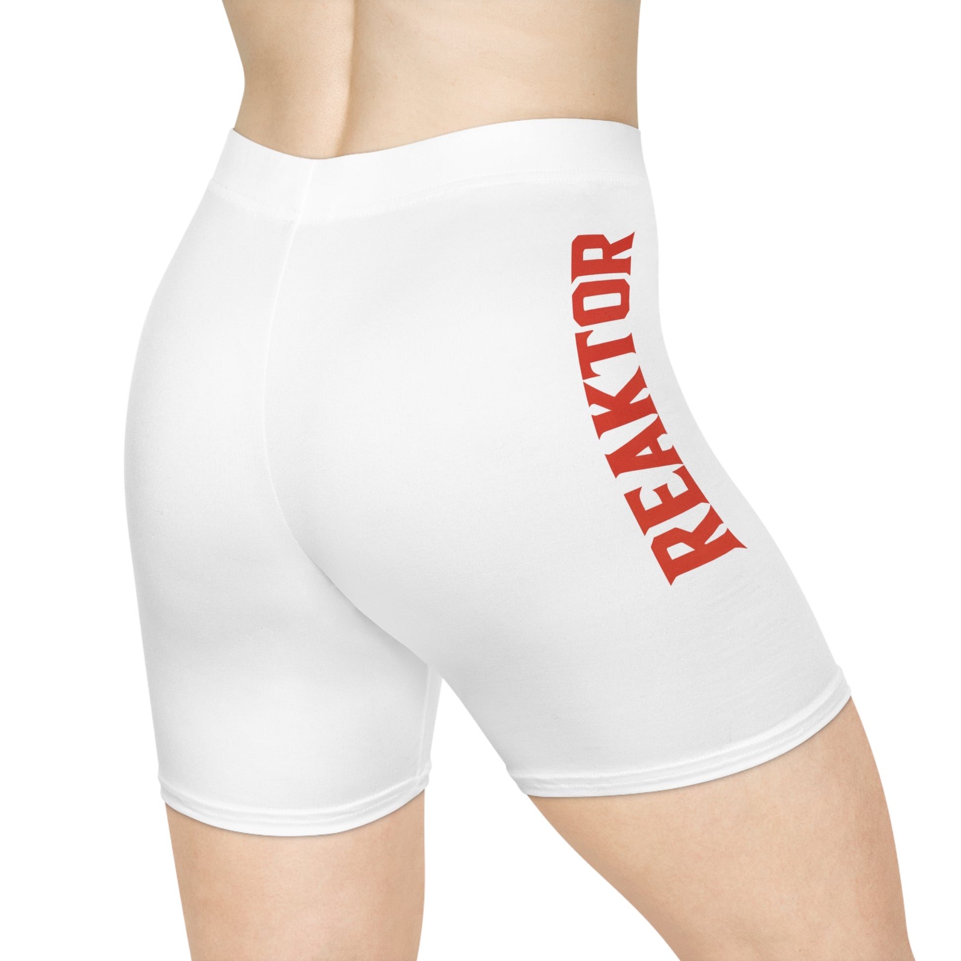 Women's biker shorts for raving, made from breathable material with a Reaktor logo. These shorts give off a trendy and energetic vibe, perfect for music festivals and dance events. Designed for women who enjoy standing out in the crowd and showcasing their unique style. Ideal for summer parties, music festivals, and raves.